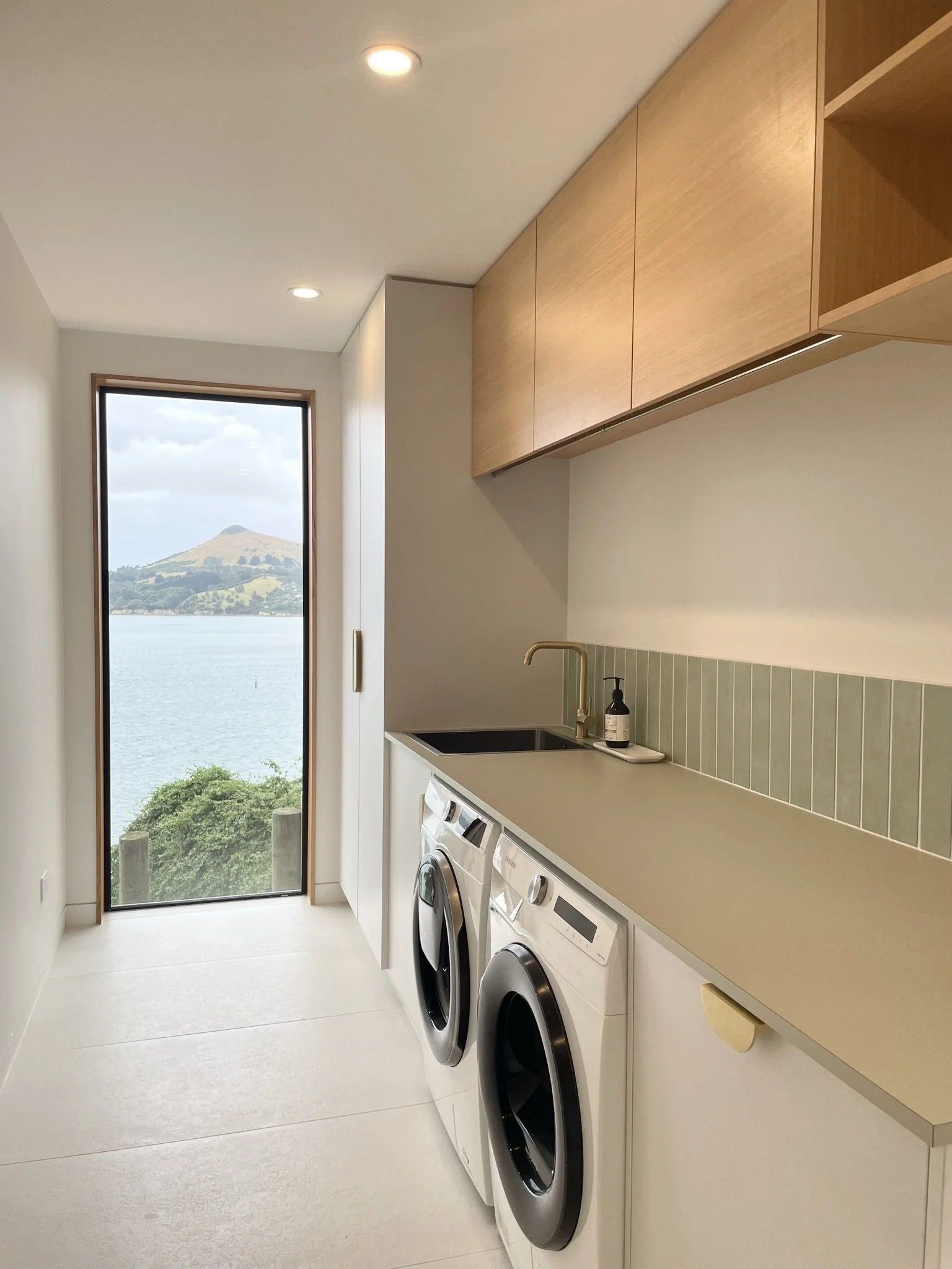 A modern laundry, wardrobe, vanity unit and bar area fitted into this Dunedin new build.